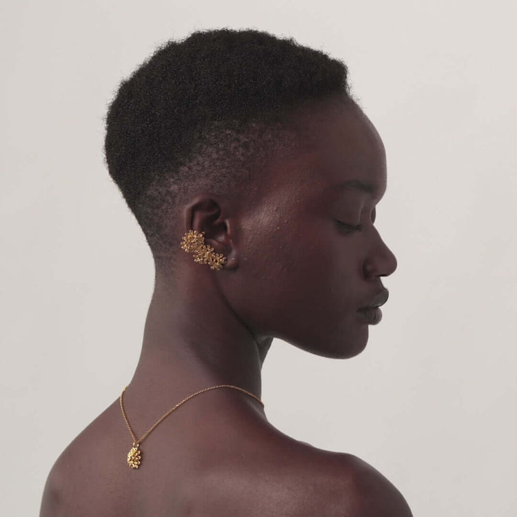 Este colgante se puede llevar con el pendiente colgante correspondiente, los cuff o los pendientes de botón, o con el anillo "flores florecidas".