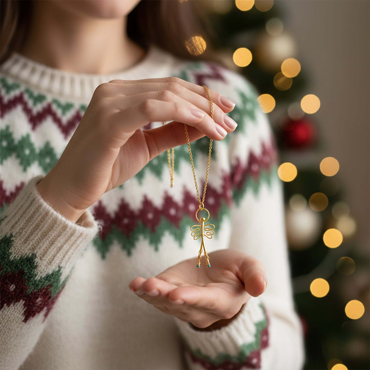O pingente é feito de prata 925 e revestido com douramento 24K, enquanto nas extremidades das “pernas” do anjo foram colocados dois zircónias turquesa, que conferem cor e simbolismo celestial.